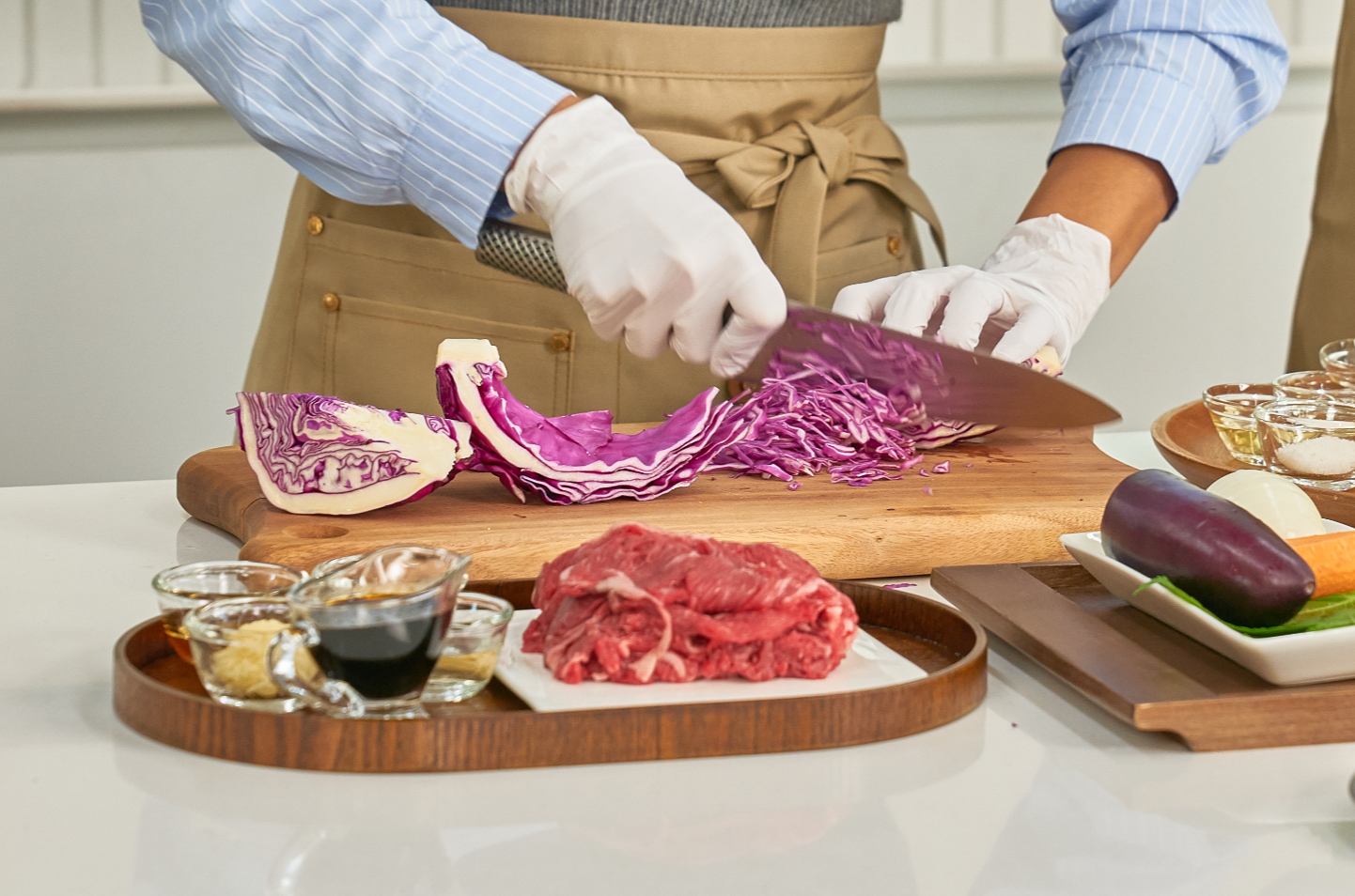 오늘 저당 레시피의 킥은 바로 퍼플 푸드입니다! 보라색은 ‘안토시아닌’이라는 성분이 만들어내는 천연색이에요. 암이나 여러 질병을 발생시키는 활성산소를 억제하는데 효과적입니다. 심혈관질환이나 당뇨, 뇌졸중 예방, 노화 방지 등의 효능을 가지고 있어요. 오늘은 퍼플 푸드로 잘 알려져있는 가지와 적양배추를 활용해 볼게요.
