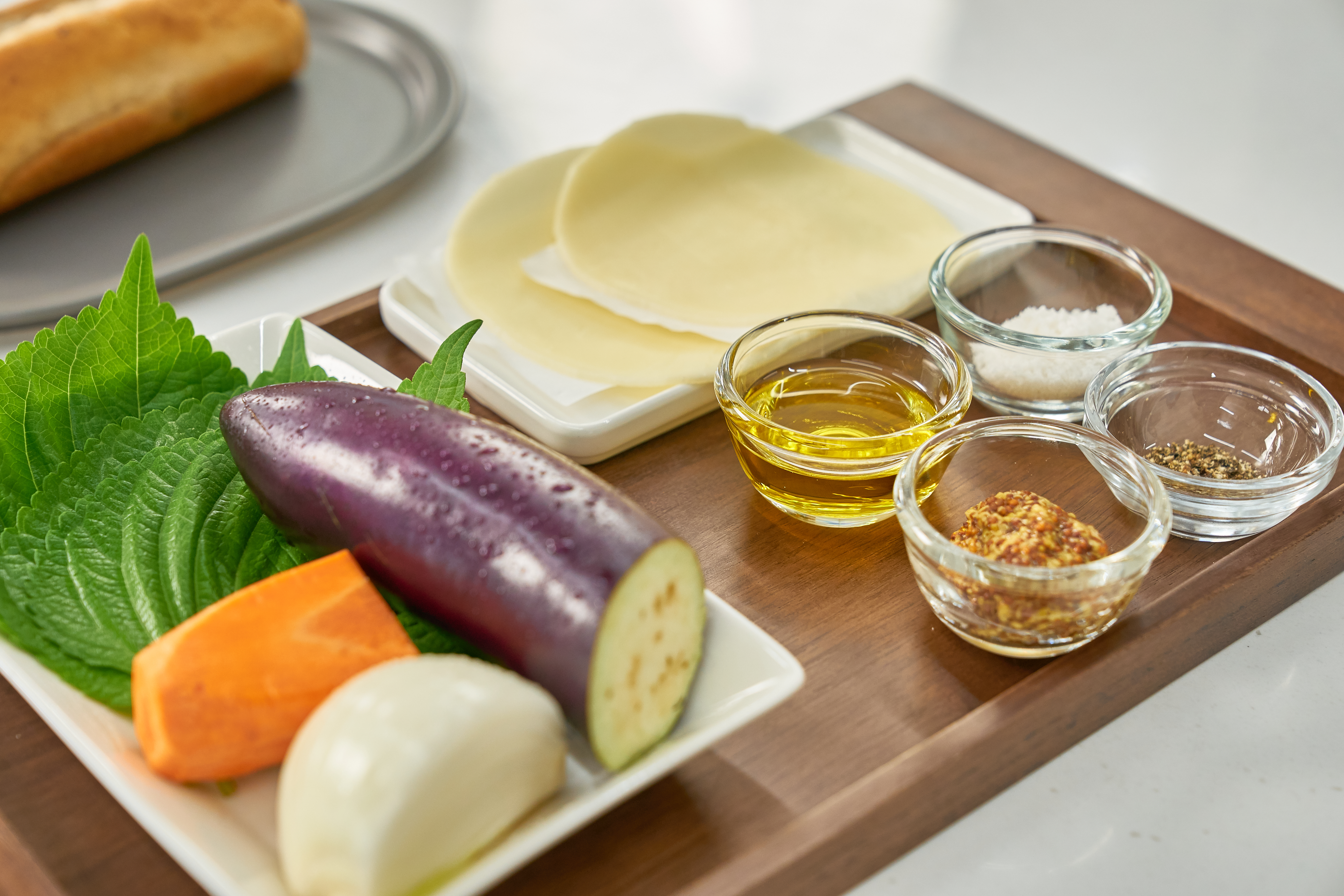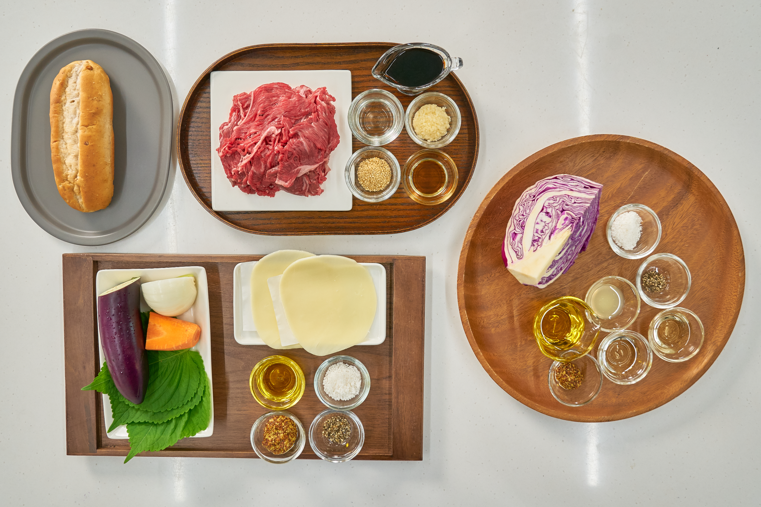 깜빠뉴 1개, 불고기 300g, 가지 60g, 양파 40g, 당근 20g, 깻잎 3장, 프로볼로네 치즈 2장, 올리브오일 1큰술, 홀그레인 머스터드 2큰술, 소금, 후추, 저당 맛간장 2큰술, 다진 마늘 1큰술, 깨소금 1작은술, 참기름 1작은술, 청주 1큰술