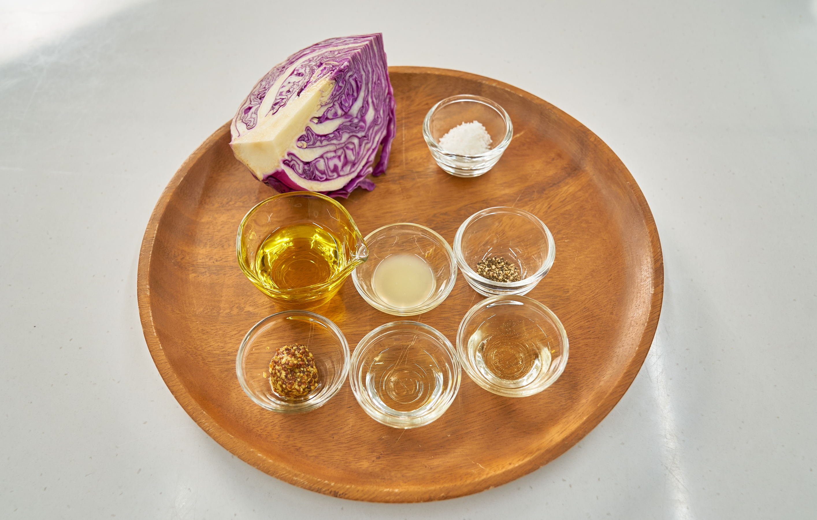 적양배추 1/4개(240g), 소금 2작은술, 올리브오일 2큰술, 홀그레인 머스터드 1작은술, 알룰로스 1작은술, 식초 1큰술, 레몬즙 1작은술, 후추
