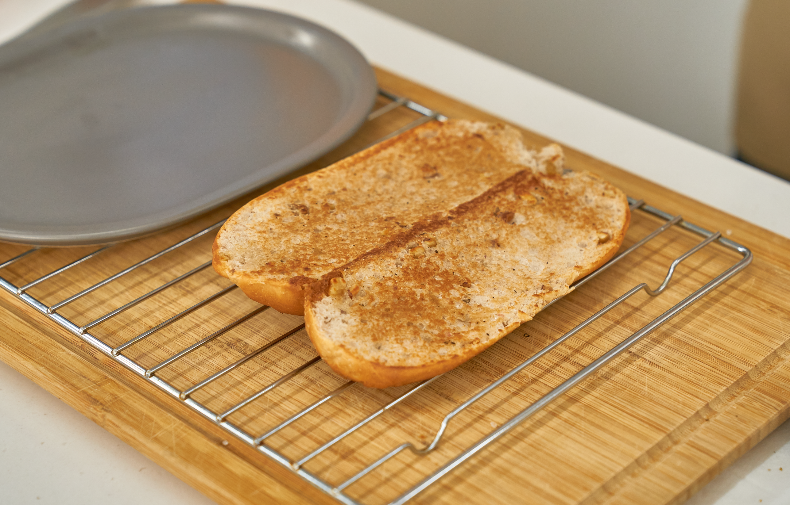 ③ 깜빠뉴는 반을 갈라 소금, 후추, 올리브오일을 뿌린 후 팬에 노릇하게 굽습니다.