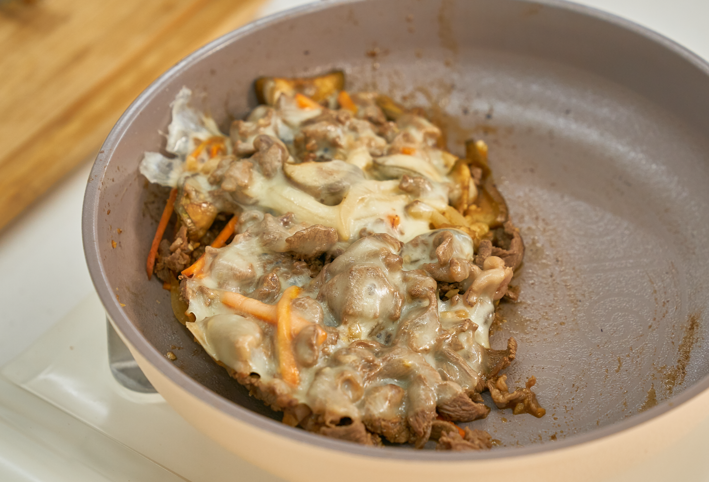⑥ 어느정도 익은 고기 위로 프로볼로네 치즈를 얹고, 팬의 뚜껑을 덮어 치즈를 녹여주세요.