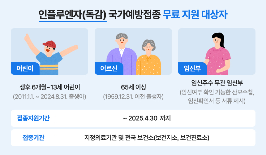 독감은 해마다 유행하고 전염성이 높으며 노약자나 기저질환자가 감염될 경우 합병증이 유발돼 치명적일 수 있기 때문에, 정부에서는 매해 어린이, 어르신, 임신부를 대상으로 인플루엔자 국가예방접종 지원사업을 운영하고 있습니다. 접종 무료 대상에 해당한다면 전국의 지정의료기관 및 보건소(보건지소, 보건진료소)에서 무료로 독감예방접종을 받으실 수 있어요.