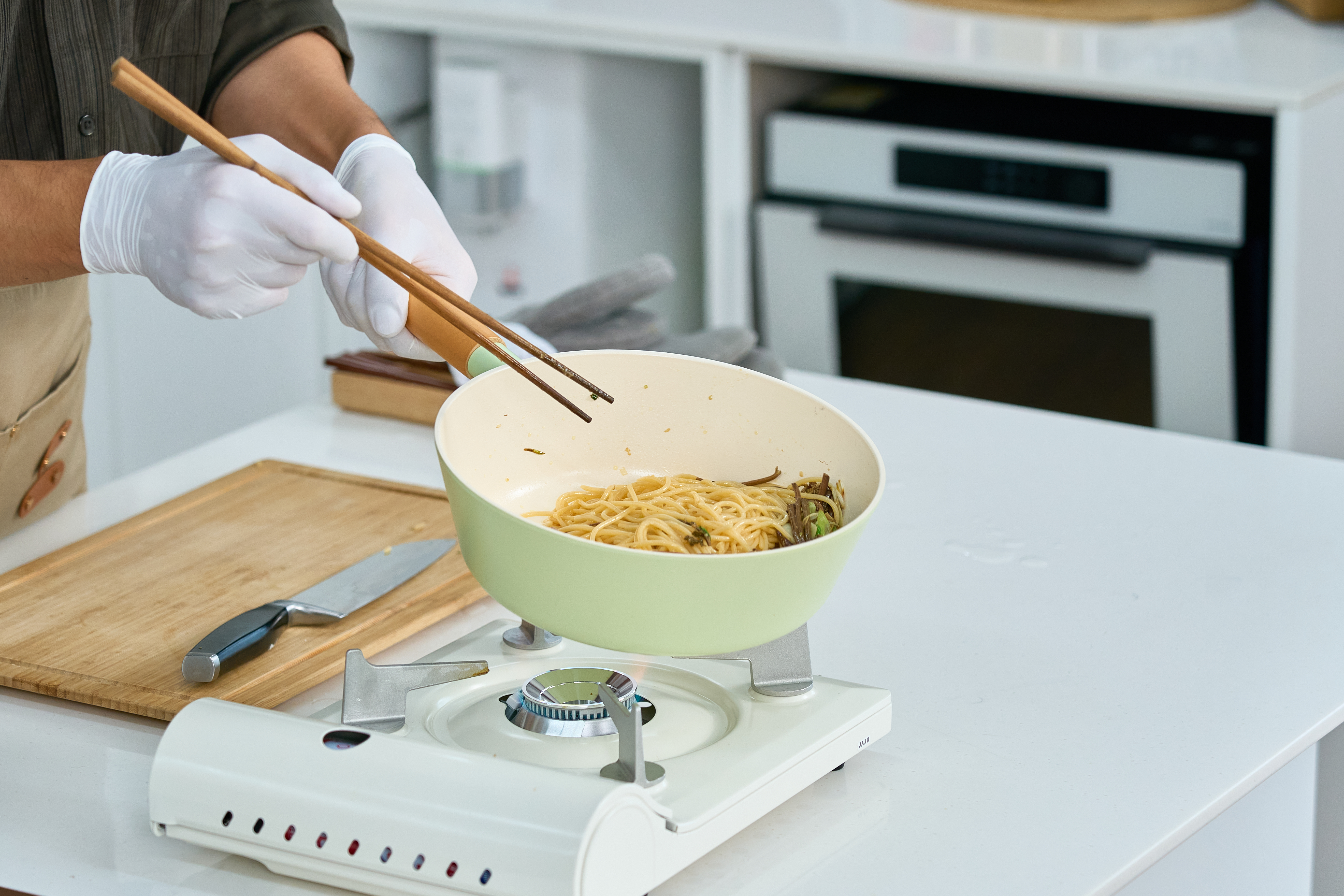 ⑥ 오목한 팬에 올리브오일과 들기름을 섞어서 두른 후 대파와 마늘을 먼저 볶은 뒤 고사리와 스파게티 면을 넣고 볶다가 저당 맛간장으로 간을 맞춰 주세요.