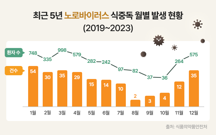 식품의약품안전처의 조사를 자세히 살펴보면, 5년 동안 노로바이러스 식중독 발생 수는 243건, 환자 수는 4,279명을 기록하였는데요. 월별 발생 추이를 보면 12월부터 이듬해 2월까지 발생한 식중독 건수가 119건으로, 전체 식중독 건수의 49%가 겨울철에 발생한 것을 확인할 수 있습니다.