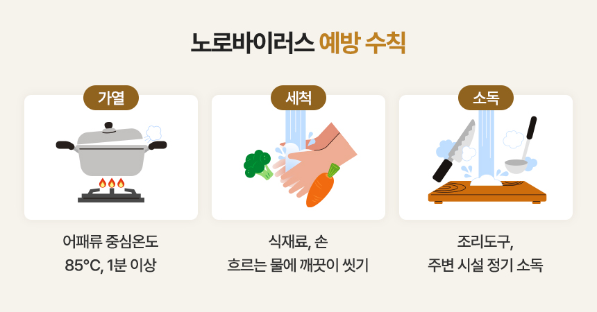 지하수를 섭취하는 가정이나 음식점에서는 겨울에 정기적인 수질 검사를 통해 노로바이러스 오염 여부를 확인해야 합니다. 또한 오염이 의심되는 경우 반드시 끓여서 물을 마시는 것이 좋은데요. 마찬가지로 85℃, 1분 이상 가열, 잊지 마세요! 노로바이러스는 열에 취약합니다.