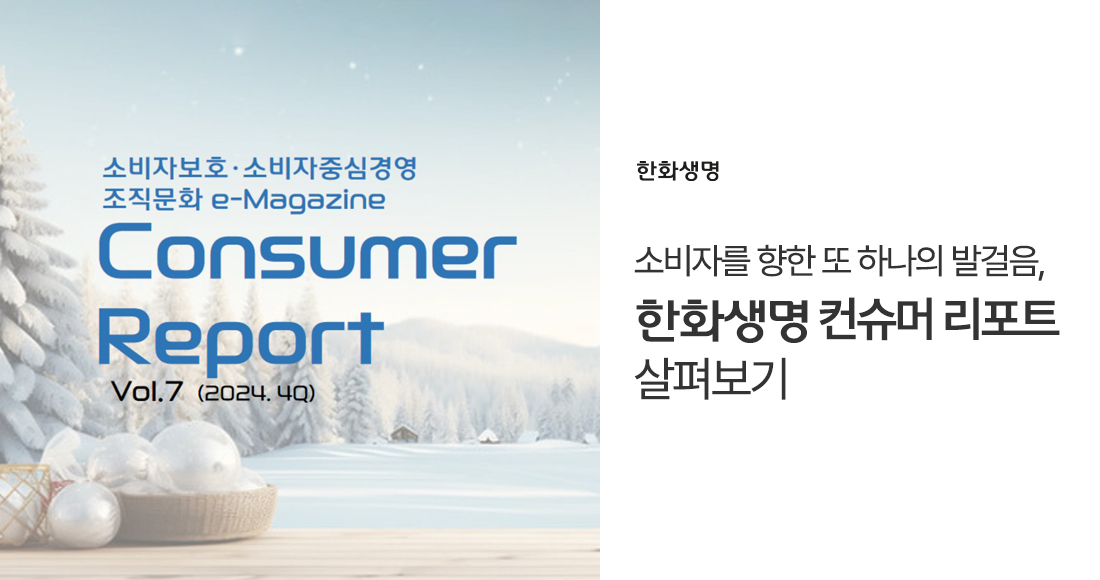 어느덧 2024년 4분기도 끝나갑니다! 금융소비자 권익 증진과 소비자경험 개선을 최우선의 가치로 삼는 한화생명이 소비자보호·소비자중심경영 조직문화를 사내에 확산시키기 위해 분기별로 공유하는 「컨슈머 리포트」도 4분기 내용으로 다시 돌아왔어요!