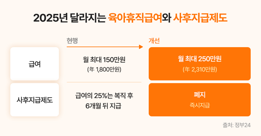 개정안 시행 전에 육아휴직을 시작했더라도 휴직 시작 시점과 무관하게 2025년부터는 모두에게 인상된 급여 금액이 적용될 예정이에요.