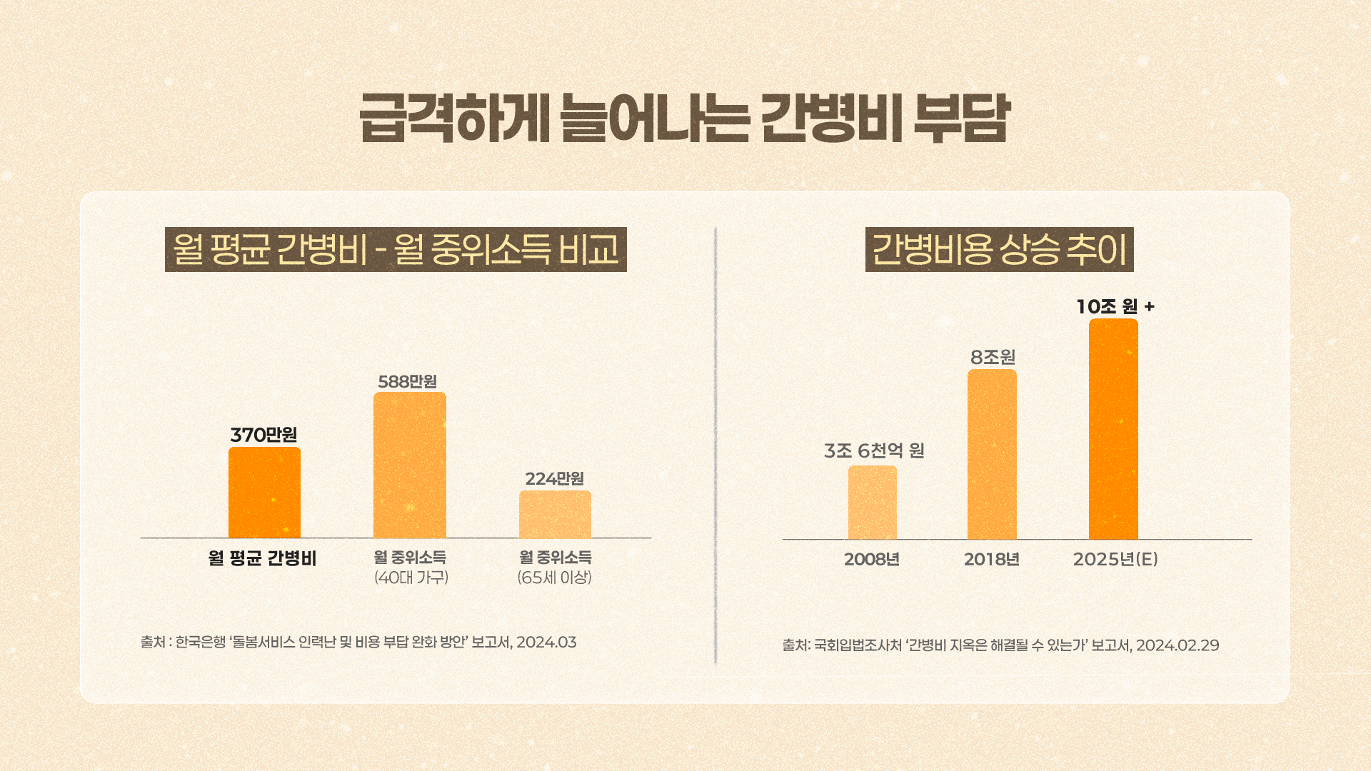 최근 간병비가 급격하게 증가하고 있습니다. 2024년 기준 하루 평균 간병비는 12~15만 원, 한 달 평균 약 370만 원에 달합니다. 이는 65세 이상 월 중위소득을 훌쩍 뛰어넘는 금액으로, 많은 가정에 큰 재정적 부담으로 다가오고 있습니다. 국회입법조사처에 따르면 2008년 연간 약 3조 6000억 원이었던 전체 간병비가 2025년에는 연간 10조 원을 돌파할 것이라고 합니다. 간병비가 이처럼 빠르게 증가하는 이유는 무엇일까요?