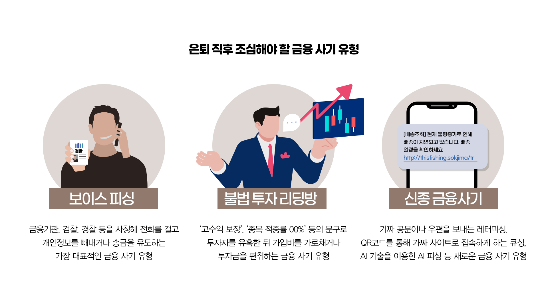 은퇴 직후의 60대는 그동안 모은 자산을 노리는 금융사기의 표적이 될 가능성이 높아요. 자산이 가장 많은 시기이지만, 소득이 줄어들면서 조급한 마음이 들기 쉽기 때문인데요. 이런 상황을 노려 각종 금융사기가 더욱 교묘해지고 있는 만큼 각별한 주의가 필요합니다. 대표적인 금융사기로는 보이스피싱과 불법 투자 리딩방이 있으며, 최근에는 AI 피싱, 큐싱, 레터피싱 등 새로운 수법이 끊임없이 등장하고 있어 더욱 신중한 대처가 필요합니다.