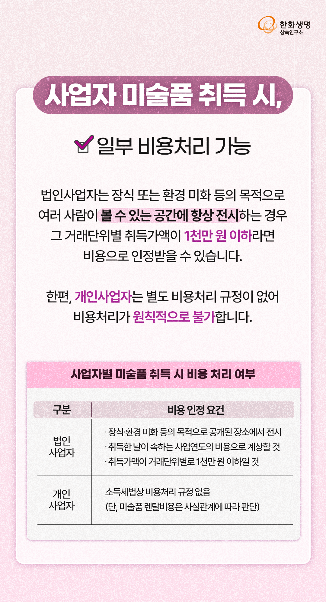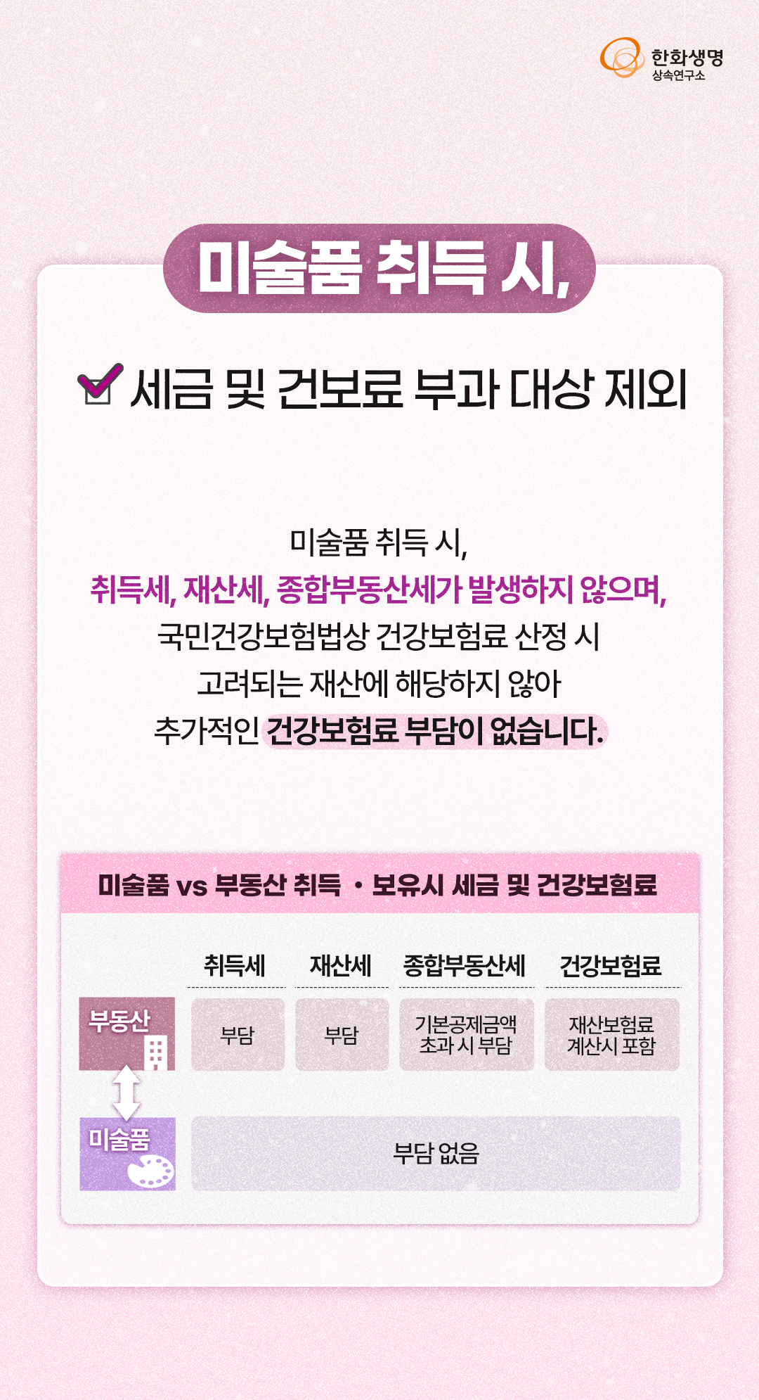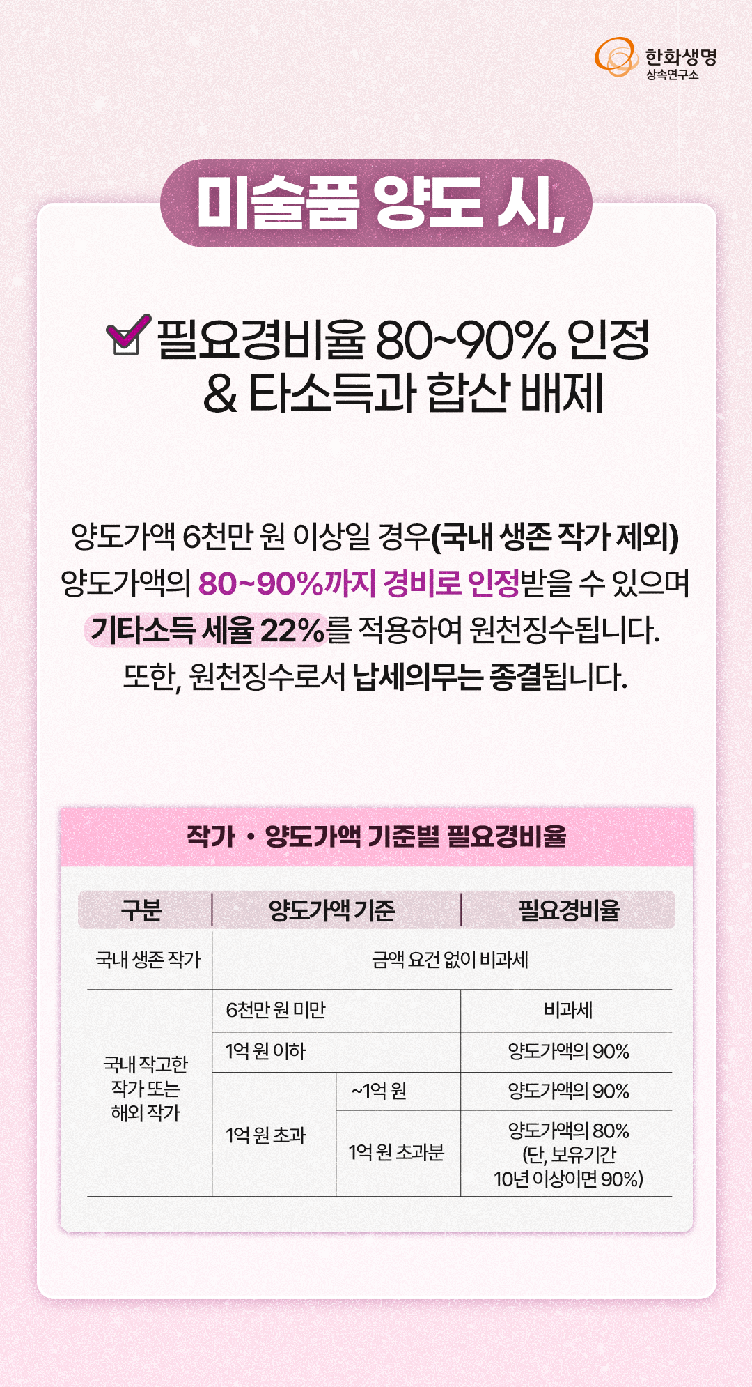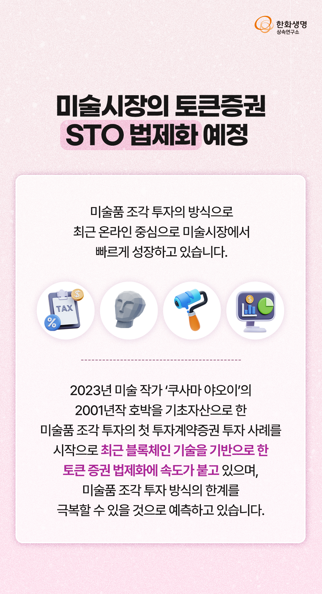 상속연구소 미술로 하는 절세투자, 아트 세테크와 최신 트렌드! (feat. 한화생명 상속연구소) 라이프앤톡 2025. 3. 14. 11:04 더 많은 정보는 한화생명 상속연구소 홈페이지에서! 👇 https://familyoffice.hanwhalife.com/ 공유하기 게시글 관리 한화생명 블로그 Life & Talk 저작자표시 (새창열림) '상속연구소' 다른 글 보러 가기 하이엔드 주택, 최신 트렌드와 접근 방안 (feat. 한화생명 상속연구소) 금 값 초강세 배경과 금 투자 방안 (feat. 한화생명 상속연구소) 상속·증여까지 미리 준비하는 청약통장 활용 전략! (feat. 한화생명 상속연구소) 노후 자산 위협하는 연령대별 Big Risk 관리! (feat. 한화생명 상속연구소)