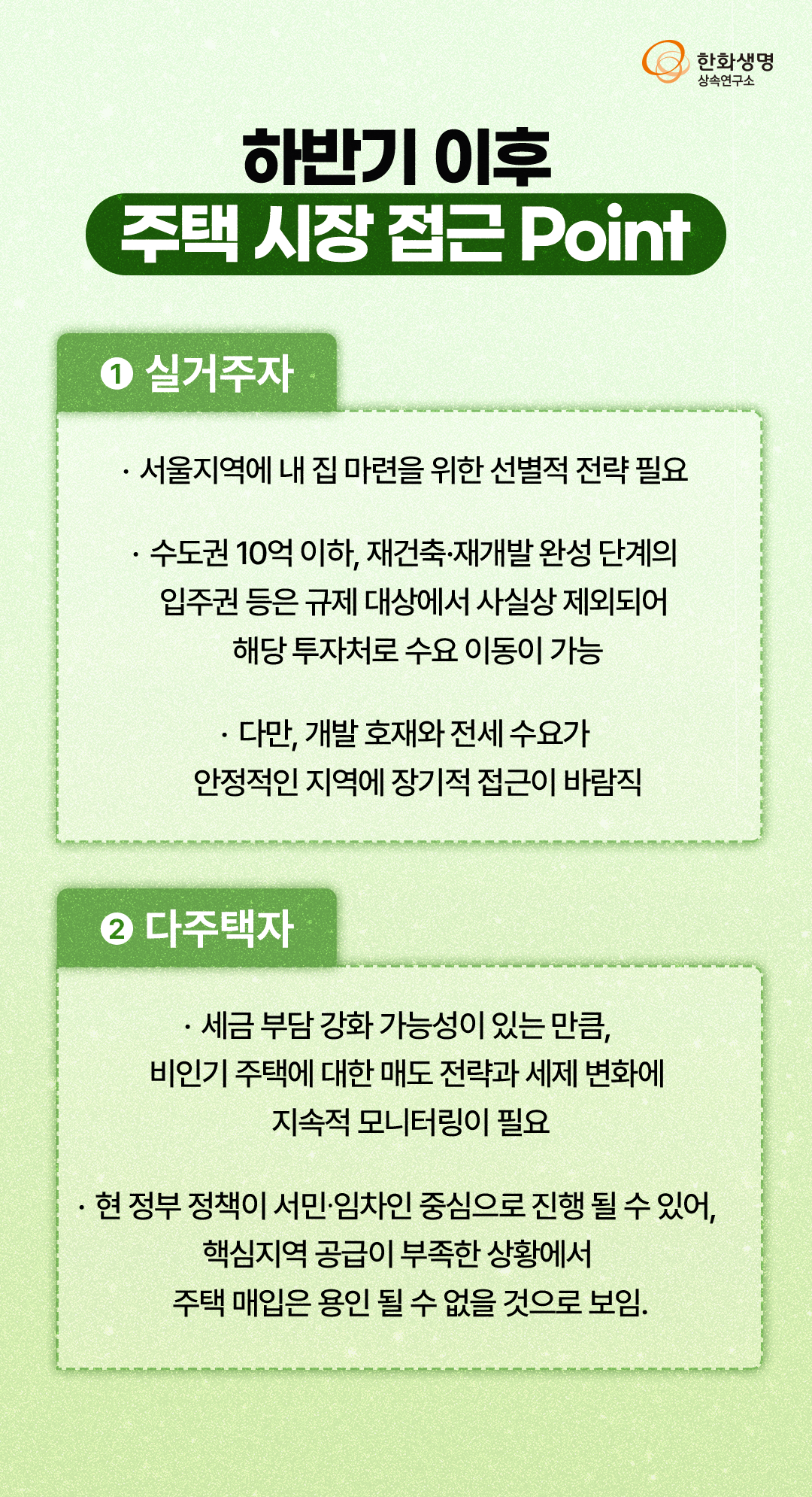 상속연구소 주택가격 초강세 배경과 6.27 대책 下 시장 대응 전략(feat. 한화생명 상속연구소) 라이프앤톡 2025. 7. 18. 11:08 더 많은 정보는 한화생명 상속연구소 홈페이지에서! 👇 https://familyoffice.hanwhalife.com/ 공유하기 게시글 관리 한화생명 블로그 Life & Talk 저작자표시 (새창열림) '상속연구소' 다른 글 보러 가기 미래를 든든하게, 보험금청구권 신탁 알아보기 가상자산 거래 유형 A to Z : 과세 실전 매뉴얼 (feat. 한화생명 상속연구소) 내가 가입한 연금, 상속은 어떻게 될까? (feat. 한화생명 상속연구소) 절세상품을 활용한 재테크와 세테크 (feat. 한화생명 상속연구소)
