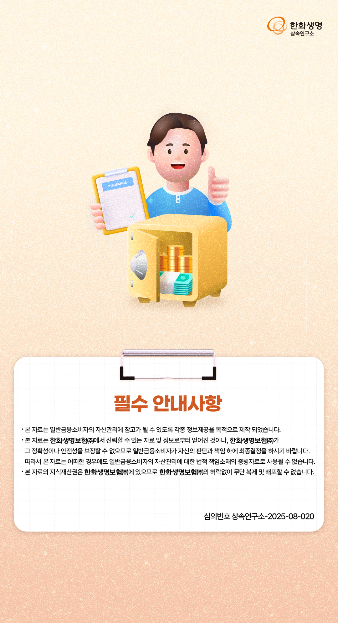 상속연구소 미래를 든든하게, 보험금청구권 신탁 알아보기 라이프앤톡 2025. 8. 25. 11:03 더 많은 정보는 한화생명 상속연구소 홈페이지에서! 👇 https://familyoffice.hanwhalife.com/ 공유하기 게시글 관리 한화생명 블로그 Life & Talk 저작자표시 (새창열림) '상속연구소' 다른 글 보러 가기 누구에게 물려주지? 싱글&딩크를 위한 상속·증여 플랜 (feat. 한화생명 상속연구소) 연기금의 대체투자 확대 움직임과 시사점 (feat. 한화생명 상속연구소) 가상자산 거래 유형 A to Z : 과세 실전 매뉴얼 (feat. 한화생명 상속연구소) 주택가격 초강세 배경과 6.27 대책 下 시장 대응 전략(feat. 한화생명 상속연구소)