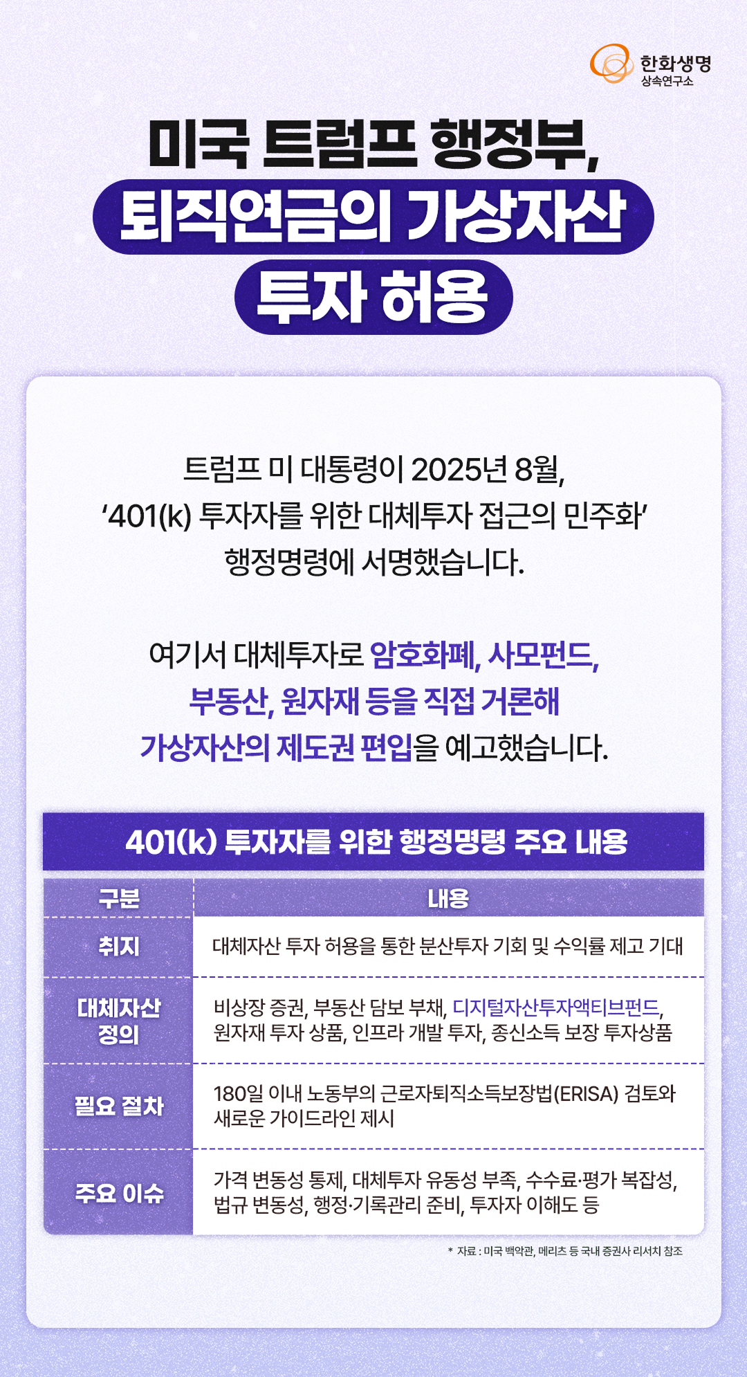 상속연구소 연기금의 대체투자 확대 움직임과 시사점 (feat. 한화생명 상속연구소) 라이프앤톡 2025. 9. 12. 10:29 더 많은 정보는 한화생명 상속연구소 홈페이지에서! 👇 https://familyoffice.hanwhalife.com/ 공유하기 게시글 관리 한화생명 블로그 Life & Talk 저작자표시 (새창열림) '상속연구소' 다른 글 보러 가기 노후자금 활용, 사망보험금 유동화 시행(feat. 한화생명 상속연구소) 누구에게 물려주지? 싱글&딩크를 위한 상속·증여 플랜 (feat. 한화생명 상속연구소) 미래를 든든하게, 보험금청구권 신탁 알아보기 (feat. 한화생명 상속연구소) 가상자산 거래 유형 A to Z : 과세 실전 매뉴얼 (feat. 한화생명 상속연구소)