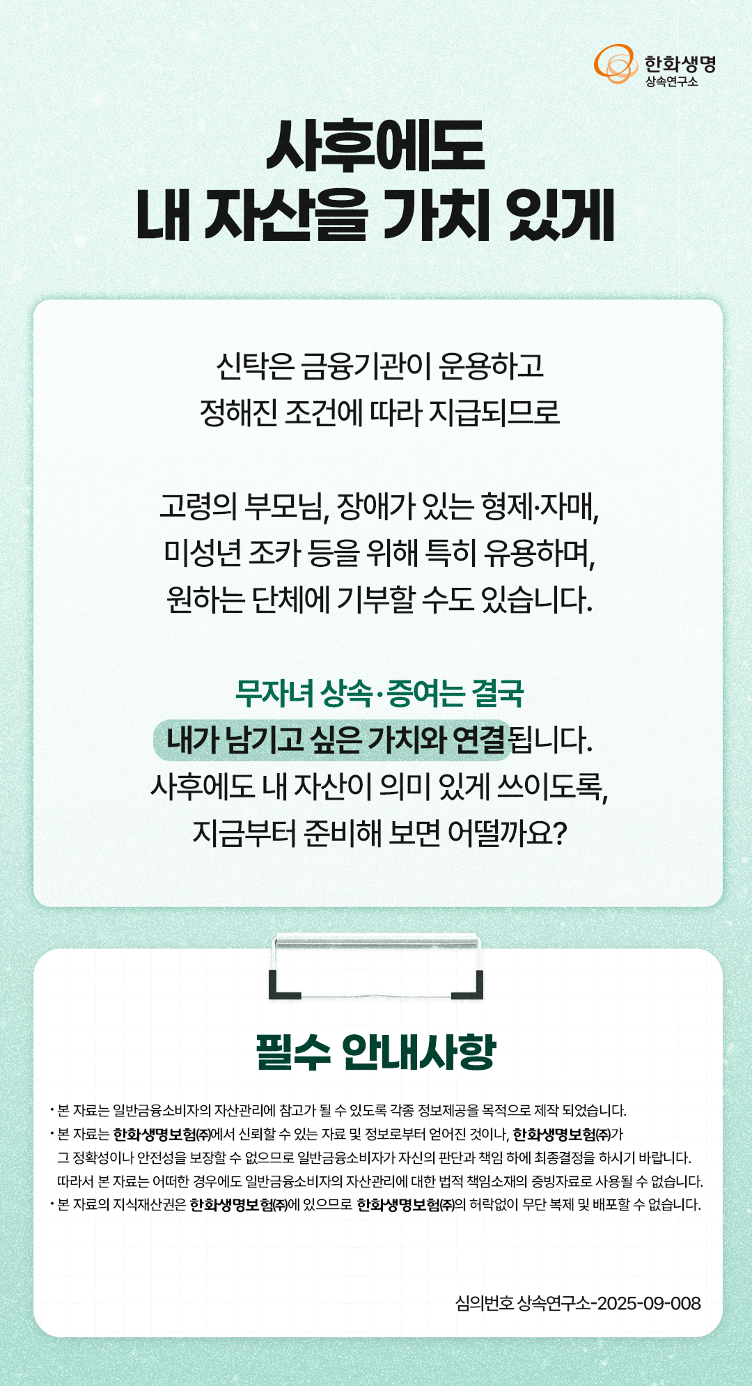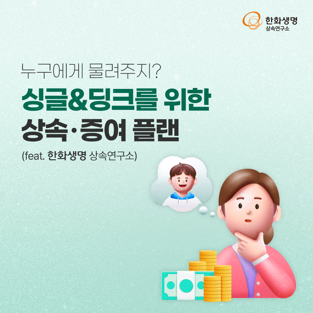 상속연구소 누구에게 물려주지? 싱글&딩크를 위한 상속·증여 플랜 (feat. 한화생명 상속연구소) 라이프앤톡 2025. 9. 19. 09:37 더 많은 정보는 한화생명 상속연구소 홈페이지에서! 👇 https://familyoffice.hanwhalife.com/ 공유하기 게시글 관리 한화생명 블로그 Life & Talk 저작자표시 (새창열림) '상속연구소' 다른 글 보러 가기 2025년, '10.15 부동산 대책' 시장 접근포인트(feat. 한화생명 상속연구소) 노후자금 활용, 사망보험금 유동화 시행(feat. 한화생명 상속연구소) 연기금의 대체투자 확대 움직임과 시사점 (feat. 한화생명 상속연구소) 미래를 든든하게, 보험금청구권 신탁 알아보기 (feat. 한화생명 상속연구소)