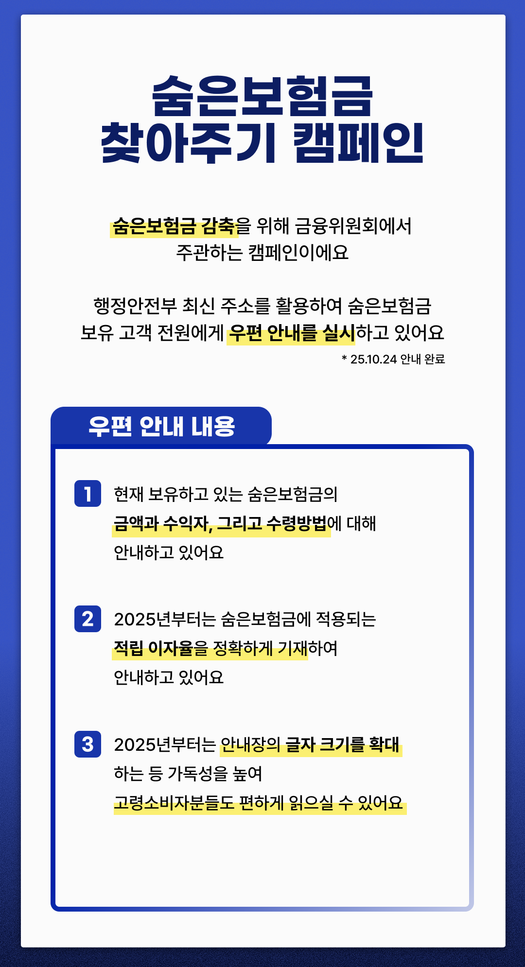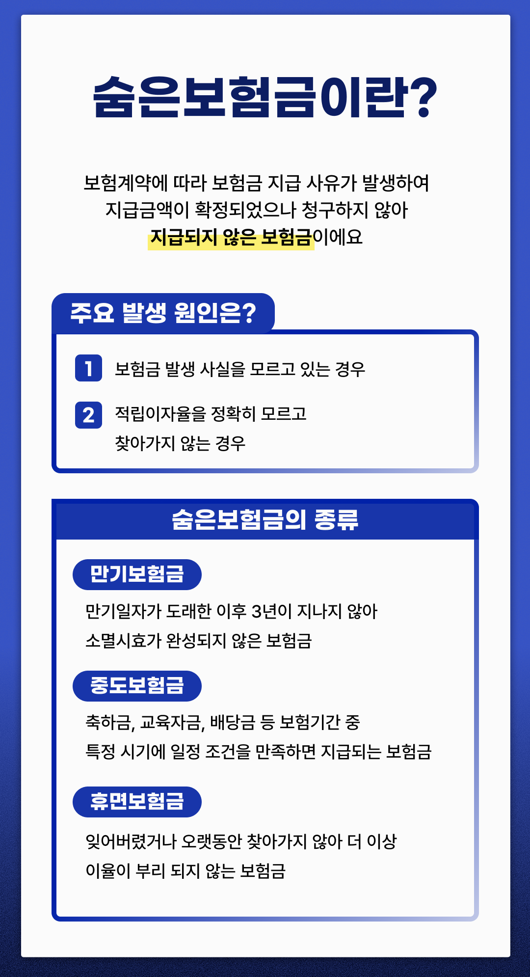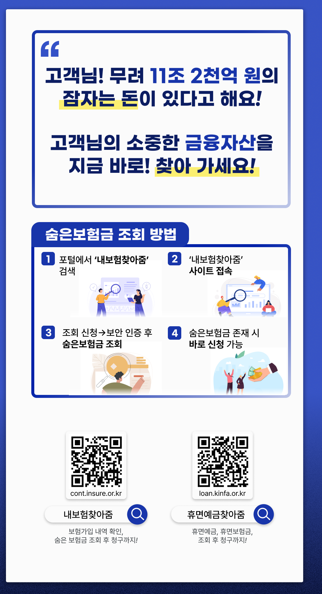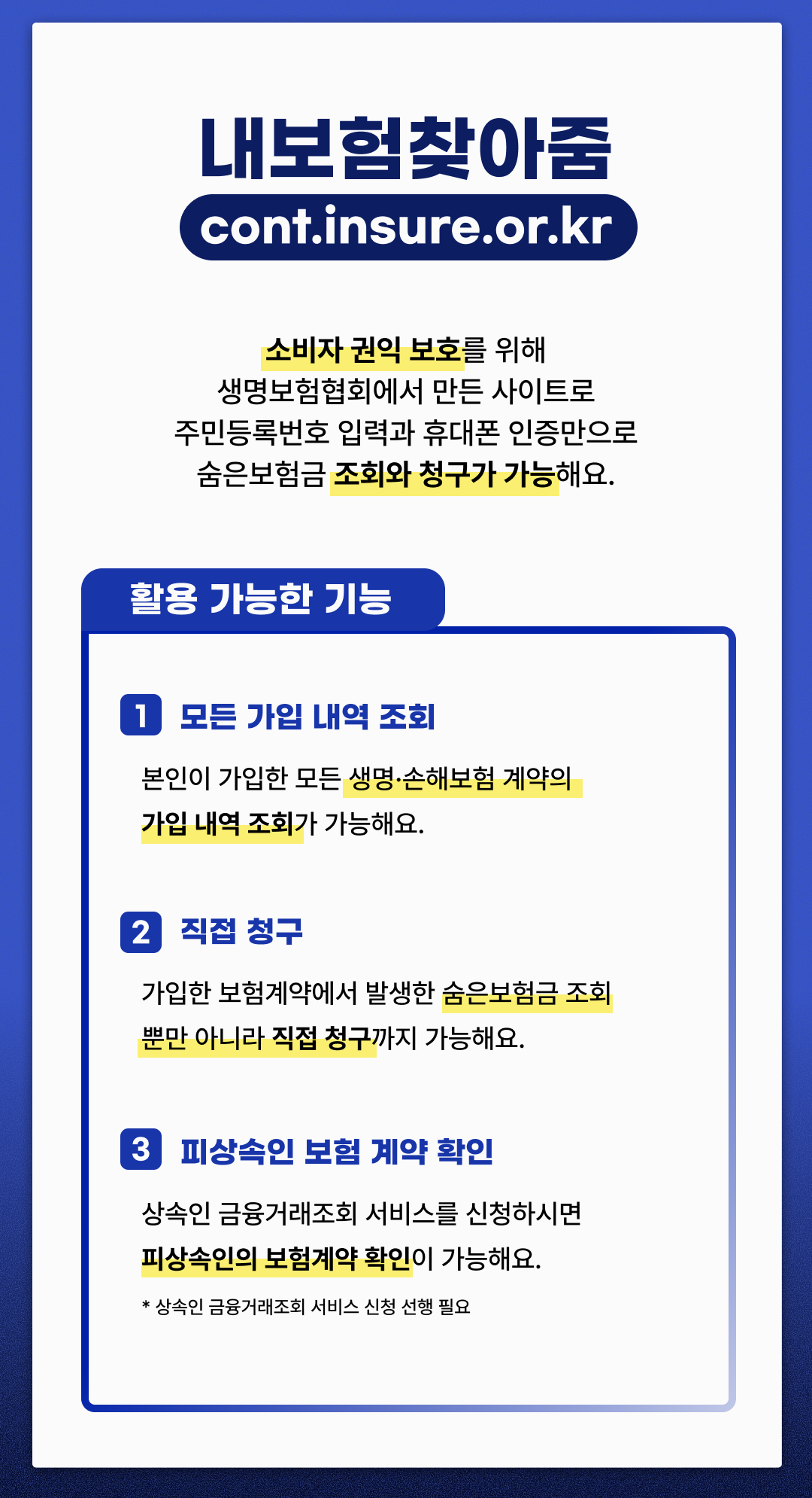 금융 지금 당장 숨은 보험금 찾아 가세요! <숨은보험금 찾아주기 캠페인> 라이프앤톡 2025. 11. 19. 13:15 '내보험찾아줌'에서잠자고 있는 보험금을 바로 확인해 보세요! 👉 https://cont.insure.or.kr 공유하기 게시글 관리 한화생명 블로그 Life & Talk 저작자표시 (새창열림) '금융' 다른 글 보러 가기 예금·적금 가입시 꼭 확인하세요! 예금보호한도 1억원으로 상향! 절대로 속지 마세요! 불법 주식 리딩방 피해 예방하려면? 신분증·휴대폰 분실했다면? ‘이것’ 신청하고 금융피해 예방하세요! 소액생계비대출 전 알아둬야 할 모든 것