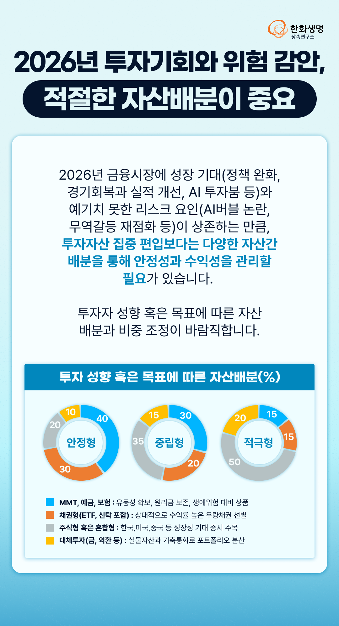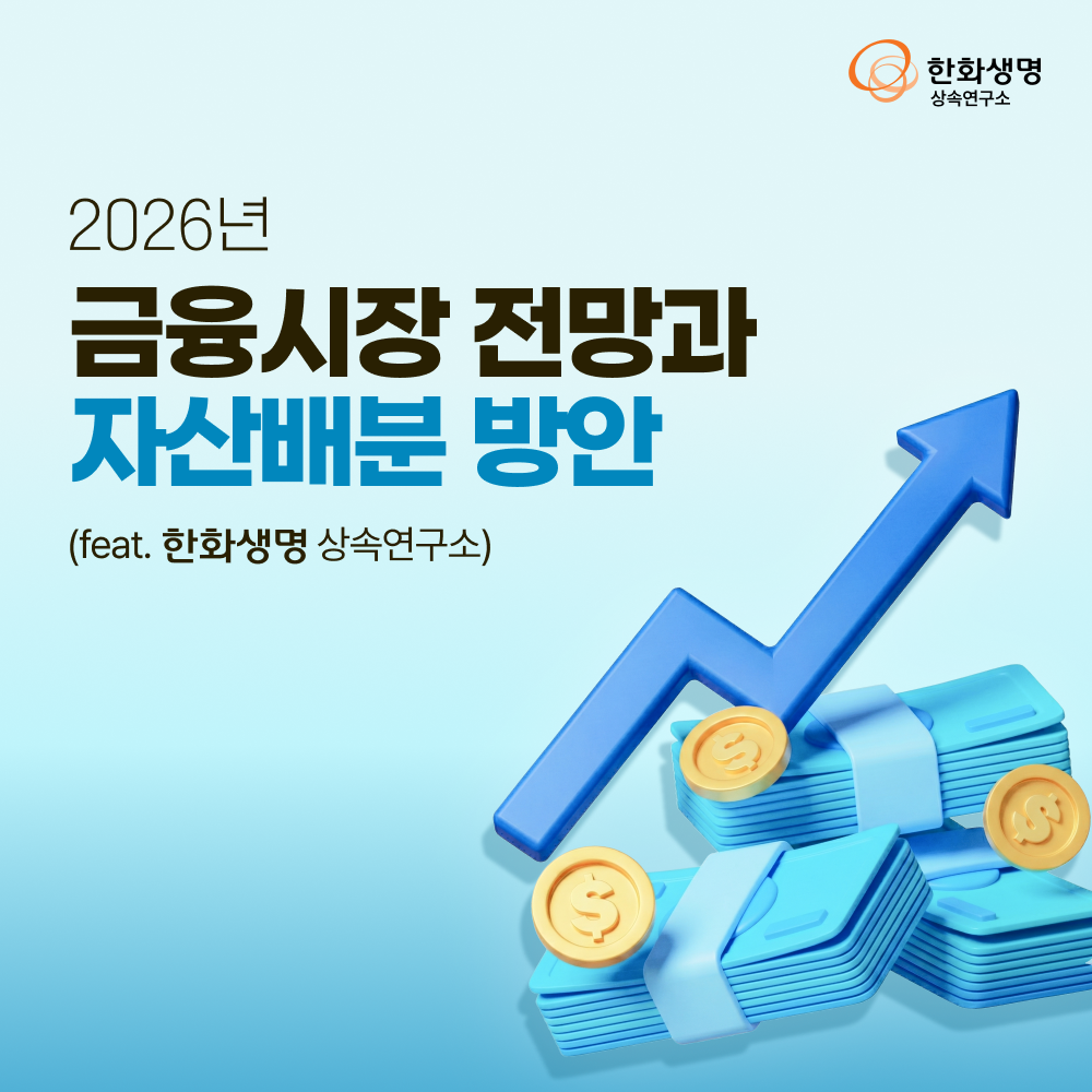 상속연구소 2026년 금융시장 전망과 자산배분 방안(feat. 한화생명 상속연구소) 라이프앤톡 2025. 12. 19. 10:09 더 많은 정보는 한화생명 상속연구소 홈페이지에서! 👇 https://familyoffice.hanwhalife.com/ 공유하기 게시글 관리 한화생명 블로그 Life & Talk 저작자표시 (새창열림) '상속연구소' 다른 글 보러 가기 고배당 분리과세, 세금 전략의 새로운 선택(feat. 한화생명 상속연구소) 2026년 주택시장 전망과 투자 접근 포인트(feat. 한화생명 상속연구소) 자산을 연금으로 바꾸는 하이브리드 노후 준비(feat. 한화생명 상속연구소) 2025년, '10.15 부동산 대책' 시장 접근포인트(feat. 한화생명 상속연구소)