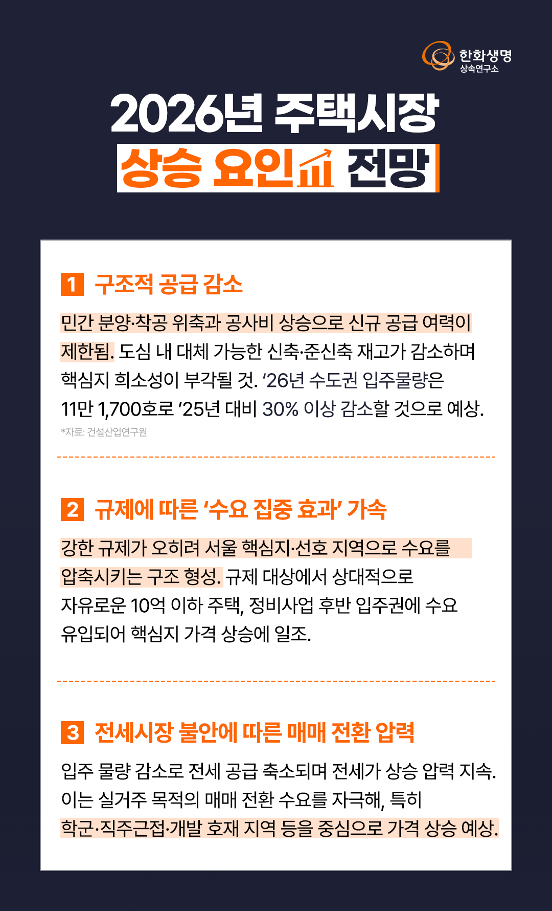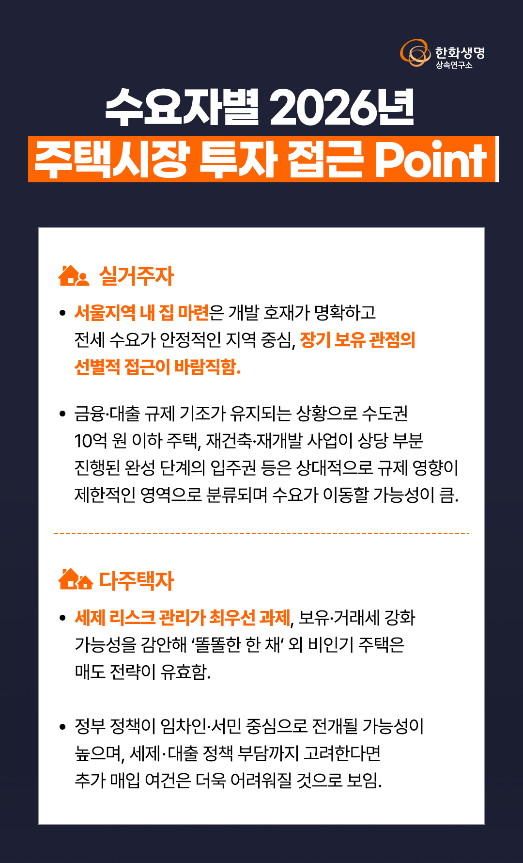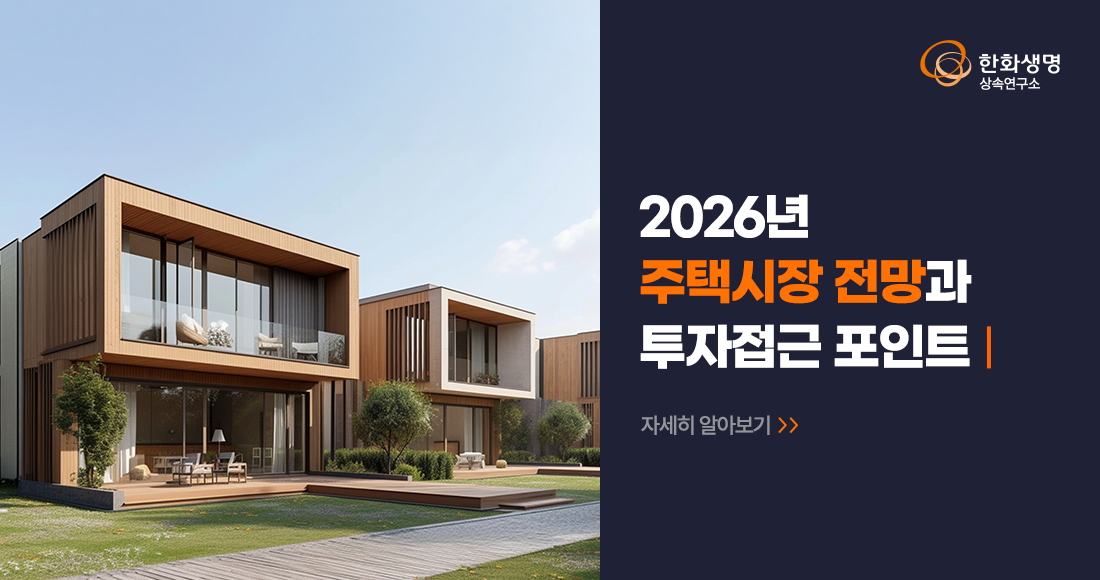 상속연구소 2026년 주택시장 전망과 투자 접근 포인트(feat. 한화생명 상속연구소) 라이프앤톡 2026. 1. 16. 11:09 더 많은 정보는 한화생명 상속연구소 홈페이지에서! 👇 https://familyoffice.hanwhalife.com/ 공유하기 게시글 관리 한화생명 블로그 Life & Talk 저작자표시 (새창열림) '상속연구소' 다른 글 보러 가기 2026년 금융시장 전망과 자산배분 방안(feat. 한화생명 상속연구소) 자산을 연금으로 바꾸는 하이브리드 노후 준비(feat. 한화생명 상속연구소) 2025년, '10.15 부동산 대책' 시장 접근포인트(feat. 한화생명 상속연구소) 노후자금 활용, 사망보험금 유동화 시행(feat. 한화생명 상속연구소)