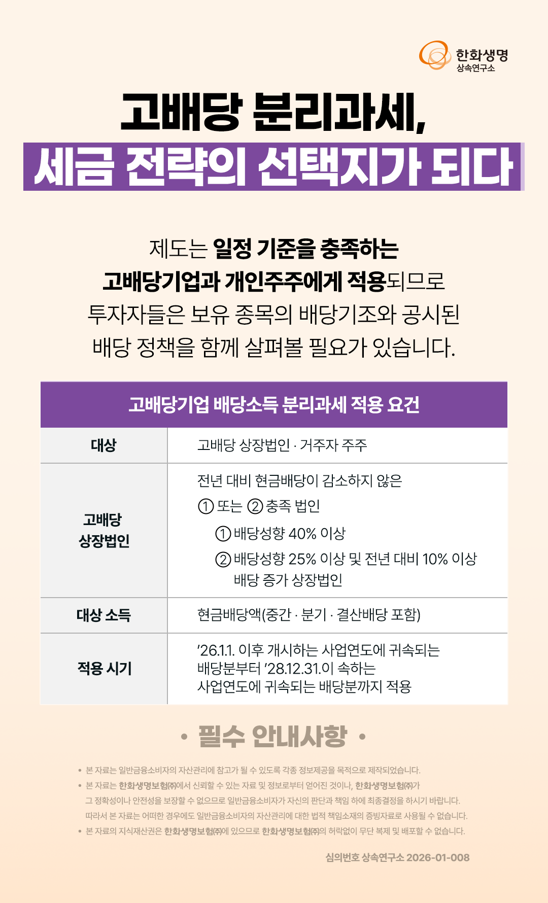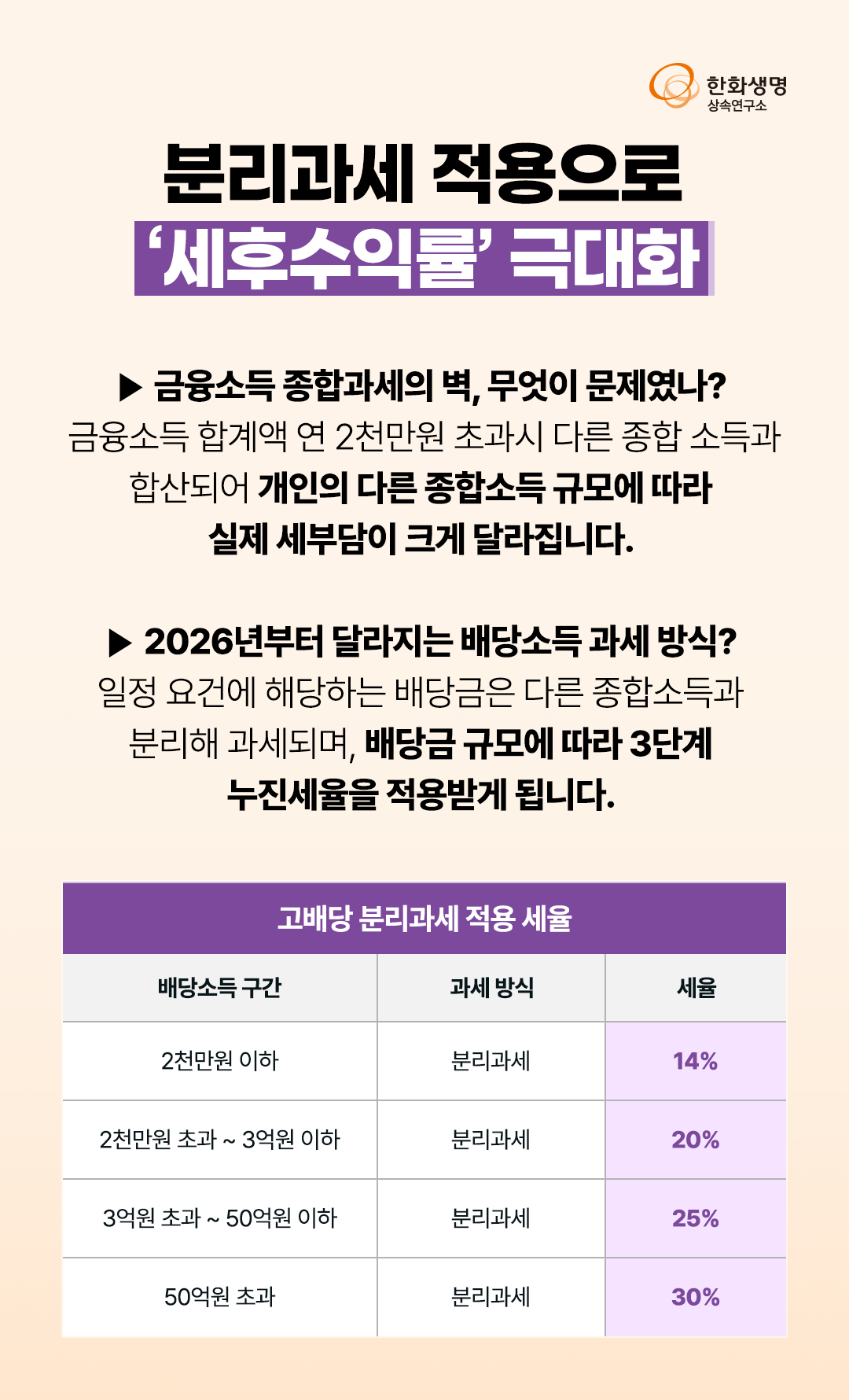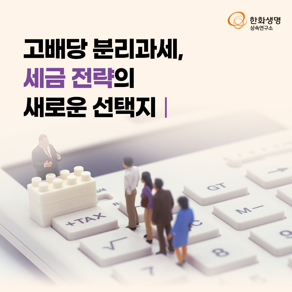 상속연구소 고배당 분리과세, 세금 전략의 새로운 선택(feat. 한화생명 상속연구소) 라이프앤톡 2026. 1. 23. 09:56 더 많은 정보는 한화생명 상속연구소 홈페이지에서! 👇 https://familyoffice.hanwhalife.com/ 공유하기 게시글 관리 한화생명 블로그 Life & Talk 저작자표시 (새창열림) '상속연구소' 다른 글 보러 가기 3040 자산가의 상속·증여 트렌드(feat. 한화생명 상속연구소) 2026년 역대급 모험자본 투입의 해, 투자전략은?(feat. 한화생명 상속연구소) 2026년 주택시장 전망과 투자 접근 포인트(feat. 한화생명 상속연구소) 2026년 금융시장 전망과 자산배분 방안(feat. 한화생명 상속연구소)