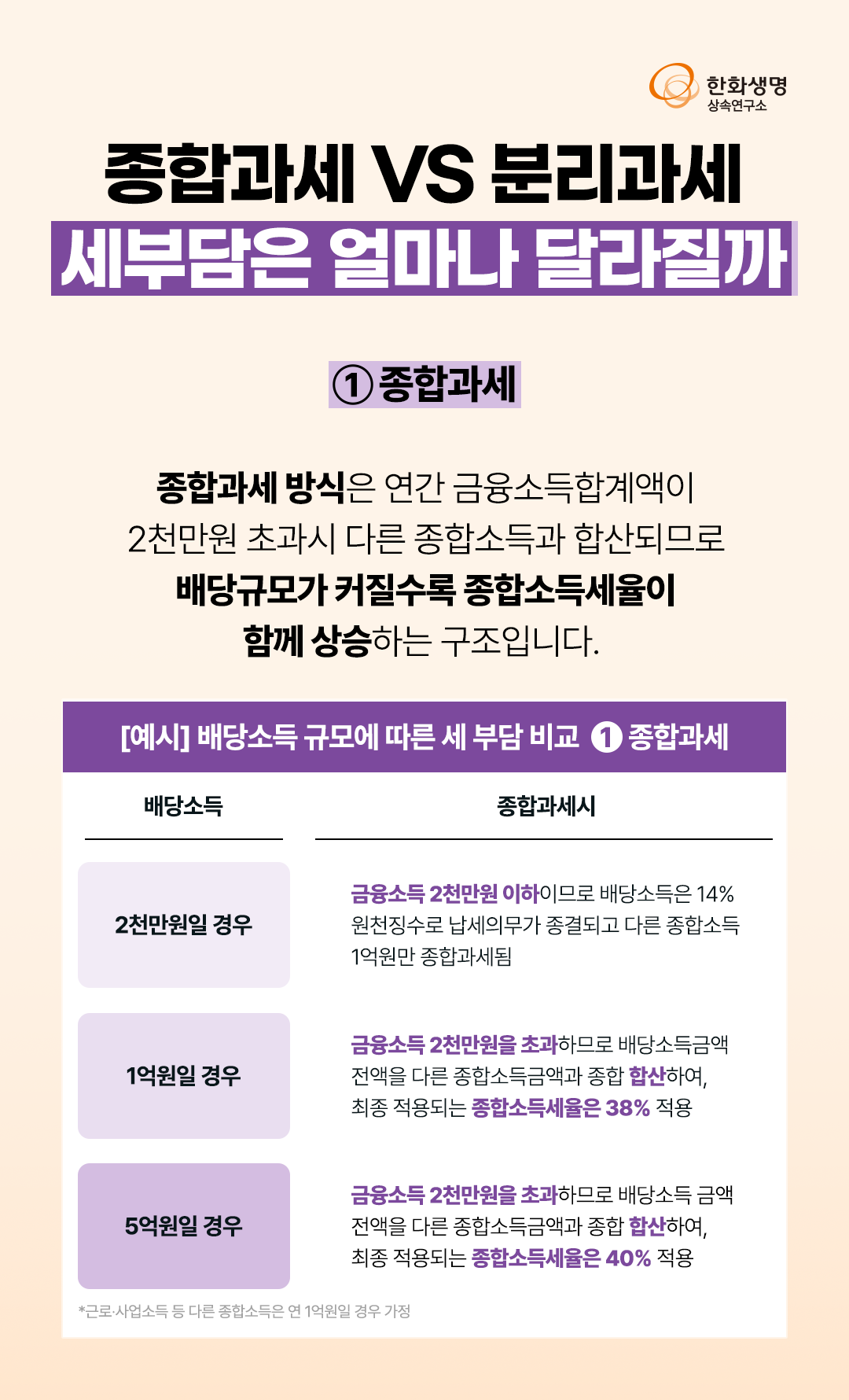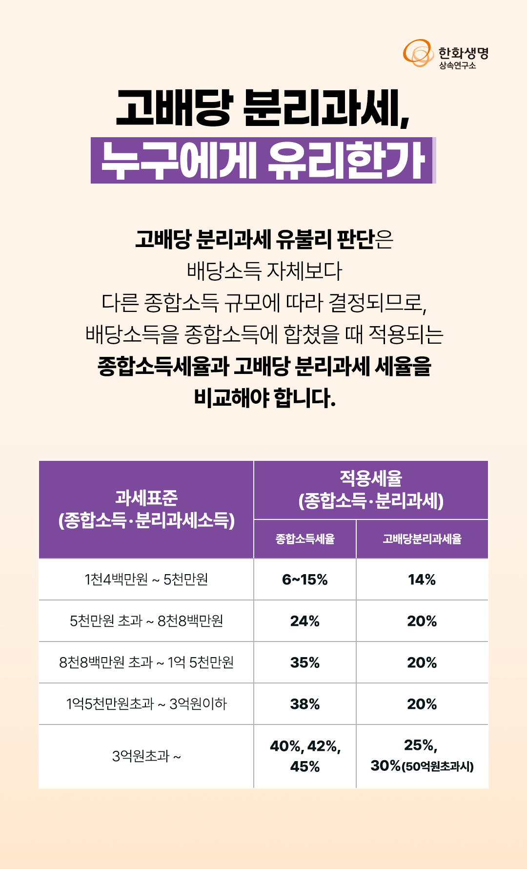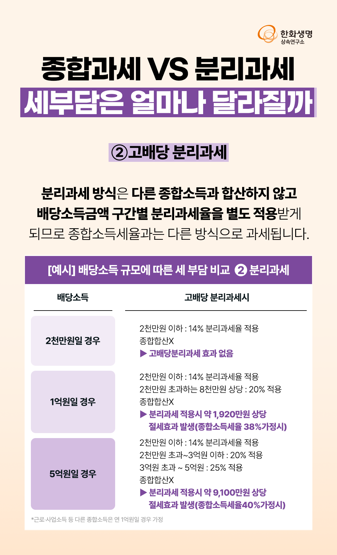 상속연구소 고배당 분리과세, 세금 전략의 새로운 선택(feat. 한화생명 상속연구소) 라이프앤톡 2026. 1. 23. 09:56 더 많은 정보는 한화생명 상속연구소 홈페이지에서! 👇 https://familyoffice.hanwhalife.com/ 공유하기 게시글 관리 한화생명 블로그 Life & Talk 저작자표시 (새창열림) '상속연구소' 다른 글 보러 가기 3040 자산가의 상속·증여 트렌드(feat. 한화생명 상속연구소) 2026년 역대급 모험자본 투입의 해, 투자전략은?(feat. 한화생명 상속연구소) 2026년 주택시장 전망과 투자 접근 포인트(feat. 한화생명 상속연구소) 2026년 금융시장 전망과 자산배분 방안(feat. 한화생명 상속연구소)