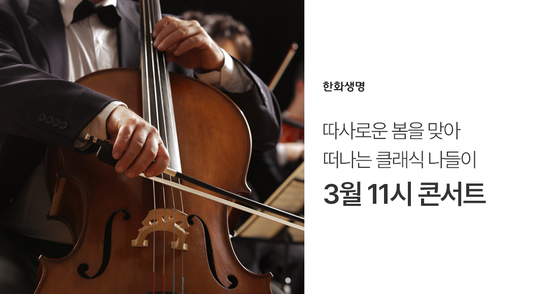 추웠던 겨울이 지나고 드디어 봄이 찾아왔습니다. 봄을 맞아 클래식과 함께 나들이를 떠나보는 건 어떨까요?한화생명이 준비한 3월 11시 콘서트에서 따듯하고 아름다운 선율과 함께 설레는 봄기운을 느껴보세요! ▶ 3월 11시 콘서트, 이 곡과 함께해요! 마르케스, 단손 제 2번 마르케스 '단손 제 2번' 첫 곡은 멕시코 출신의 작곡가 아르투로 마르케스의 단손 제 2번입니다. 감미로운 클라리넷 선율, 화려한 트럼펫 연주, 라틴 춤곡 특유의 열정적인 리듬이 인상적인 곡으로, 멕시코 현대 클래식 음악 중 가장 인기 있는 곡 중 하나인데요. 단손(Danzón)은 쿠바에서 시작되어 멕시코와 푸에르토리코에서 인기를 끌고 있는 춤곡이자 음악 장르입니다. 마르케스는 베라크루즈에 있는 무도장에서 이 춤곡의 리듬과 선율에..