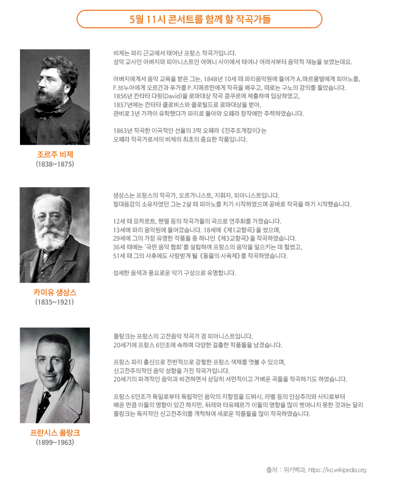 온 가족이 행복한 가정의 달. 어린이부터 어버이까지 다 함께 즐길 수 있는 문화생활이 있습니다. 바로 예술의 전당에서 준비한 5월 11시 콘서트인데요. 온가족이 한자리에서 보내는 시간만큼 소중한 시간이 또 없죠. 이번 5월 11시 콘서트에서는 낭만적이고 감미로운 선율의 프랑스 작곡가들의 곡으로 준비했으니 많은 기대 부탁드립니다.